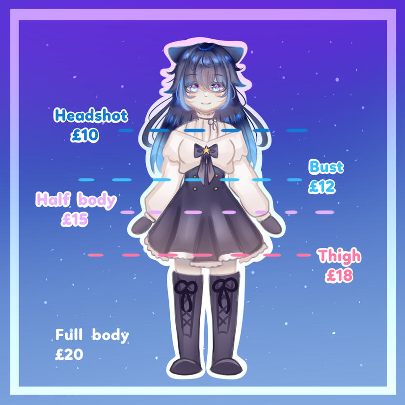 Example order: a half-body, fully shaded with a scenic background, no props and in style 1£15(half-body) + £5(fully shaded) +£5(scenic background) = £25