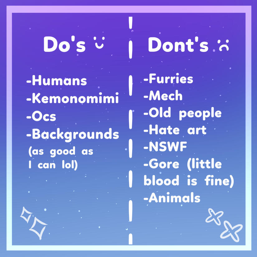 After filling out the form, please send a message via DMs on Instagram/DeviantArt so I can confirm your commission and go over the details with you (If you don't your commission form will be ignored)